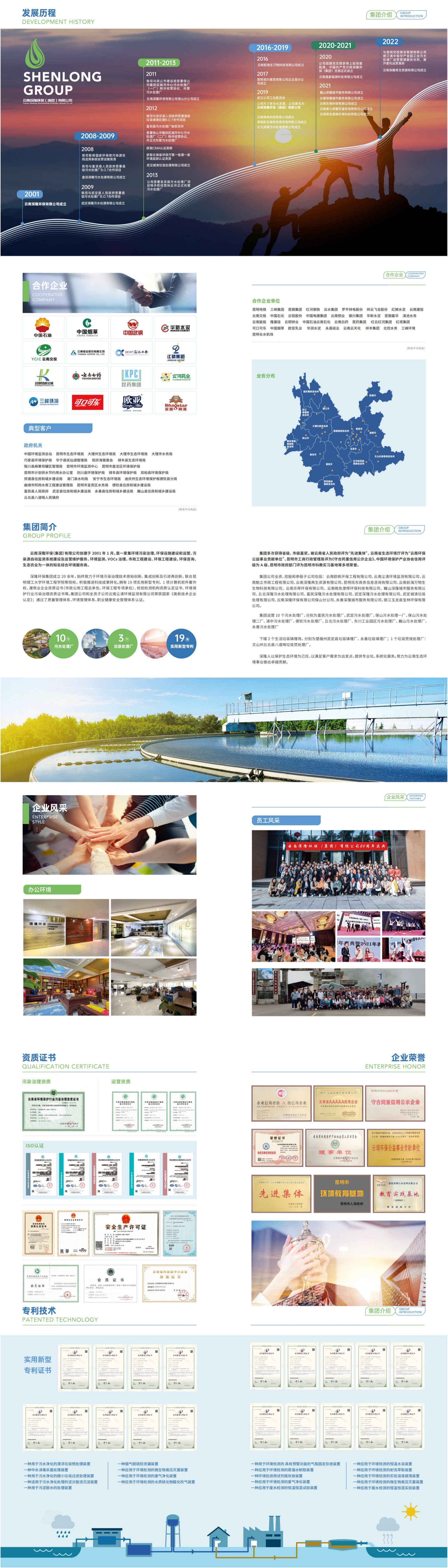 云南深隆環(huán)保(集團(tuán))有限公司2001年01月18日成立,公司注冊(cè)資本5000萬元,統(tǒng)一社會(huì)信用代碼:91530102719492536D。云南深隆環(huán)保(集團(tuán))有限公司是一家專門從事生態(tài)環(huán)境治理、環(huán)保設(shè)施運(yùn)營和環(huán)境監(jiān)測(cè)的綜合性環(huán)保科技公司。公司服務(wù)范圍包括污染源在線自動(dòng)監(jiān)測(cè)服務(wù)、環(huán)境污水治理運(yùn)營服務(wù)收和技術(shù)服務(wù),服務(wù)內(nèi)容包括:廢水處理站托管運(yùn)維、污水廠擴(kuò)容提標(biāo)服務(wù)、污染源自動(dòng)監(jiān)控系統(tǒng)運(yùn)維服務(wù)、污染源在線監(jiān)控聯(lián)網(wǎng)系統(tǒng)運(yùn)營服務(wù)、CEMS設(shè)備運(yùn)行維護(hù)服務(wù)、 VOCs自動(dòng)監(jiān)控系統(tǒng)委托運(yùn)行維護(hù)技術(shù)服務(wù)等。公司下設(shè)多家分、子公司,擁有2個(gè)實(shí)驗(yàn)室,運(yùn)營著14個(gè)污水處理廠、3個(gè)生活垃圾處理廠,公司已獲得省級(jí)表彰和獎(jiǎng)勵(lì)10余次,擁有各類環(huán)境保護(hù)資質(zhì)。認(rèn)證項(xiàng)目涵蓋水和廢水、環(huán)境空氣和廢氣、土壤和固體廢物、噪聲和振動(dòng)等類別,認(rèn)證項(xiàng)目200余項(xiàng),認(rèn)證方法標(biāo)準(zhǔn)300余項(xiàng)。歷年累計(jì)扶貧及社會(huì)公益捐贈(zèng)超過500萬元。公司兩污事業(yè)部(固廢/污水)負(fù)責(zé)運(yùn)營重點(diǎn)負(fù)責(zé)城鄉(xiāng)、市政工程,新建、擴(kuò)改建工程等項(xiàng)目污水、垃圾控制治理等方面領(lǐng)域。目前公司擁有實(shí)用新型專利10項(xiàng),軟件著作權(quán)1項(xiàng),企業(yè)標(biāo)準(zhǔn)1項(xiàng)。2022年公司獲得國家高新技術(shù)企業(yè)認(rèn)定,編號(hào):GR202253000802,通過國家科技型中小企業(yè)認(rèn)定,編號(hào):2022530102A0000726。云南深隆環(huán)保(集團(tuán))有限公司始終以市場(chǎng)為中心,以需求為導(dǎo)向,以人才為重點(diǎn),以利益為紐帶,著力在增強(qiáng)公司整體實(shí)力上下功夫。注重在激烈的市場(chǎng)競(jìng)爭(zhēng)中,自我調(diào)整,主動(dòng)適應(yīng),實(shí)現(xiàn)了以環(huán)保產(chǎn)業(yè)為主,市政基礎(chǔ)設(shè)施建設(shè)、生態(tài)環(huán)境修復(fù)、綜合環(huán)境整治、環(huán)境監(jiān)測(cè)、新能源技術(shù)推廣、城鄉(xiāng)供水、農(nóng)業(yè)科技等多業(yè)并舉,走出了一條"橫向加寬,縱向拉長(zhǎng)"的內(nèi)延式增強(qiáng)和外延式擴(kuò)張的發(fā)展道路,實(shí)現(xiàn)了量的增長(zhǎng)和質(zhì)的提升,屬于轉(zhuǎn)型升級(jí)成效明顯企業(yè)